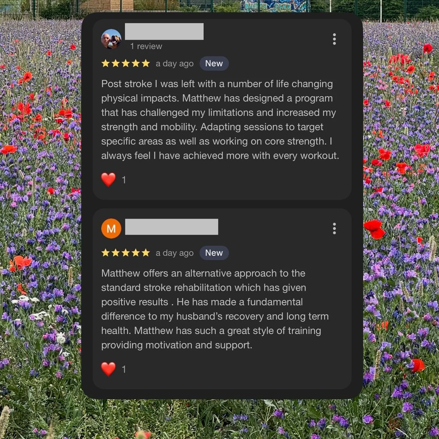 “Matthew offers an alternative approach to the standard stroke rehabilitation which has given positive results. He has made a fundamental difference to my husband’s recovery and long term health. Matthew has such a great style of training and providing motivation and support.” - M.